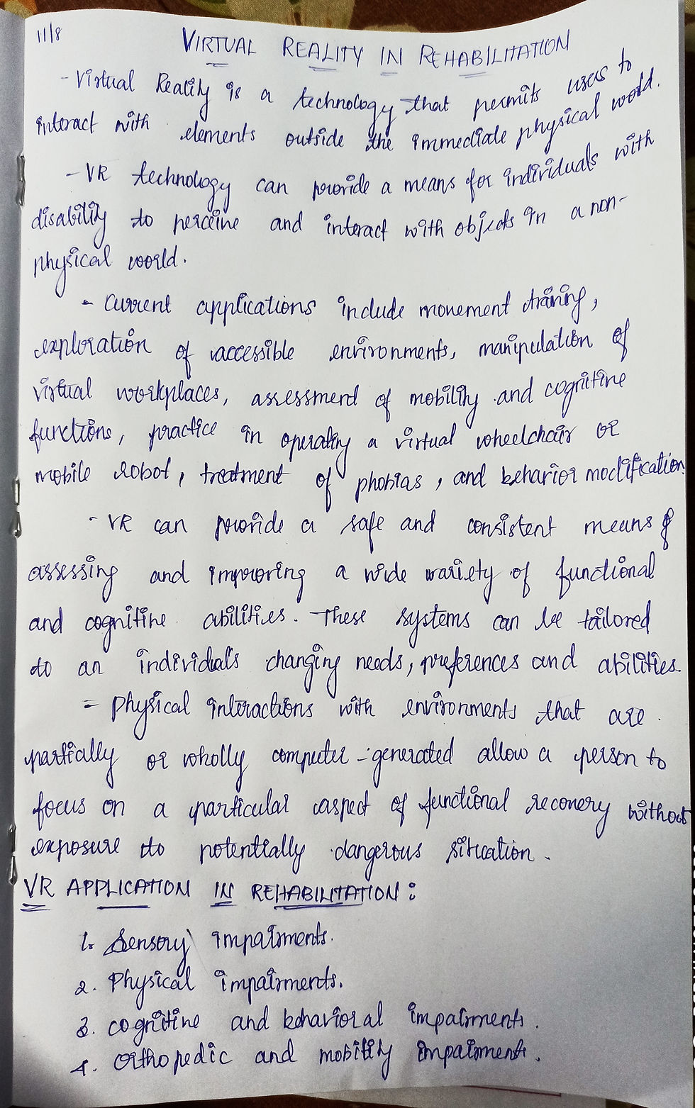 Virtual reality (VR) technologies use multimedia devices and computer simulation to allow users to interact with a simulated environment, creating life-like experience. Display devices present sensory information, such as vision, auditory, and touch, sense, to the user. Rehabilitation in healthcare refers to the treatment and process to restore good health and regain impaired functions and abilities. Virtual Reality (VR) has recently emerged as a valid addition to conventional therapy by incorporating rehabilitation strategies in a novel and low-cost approach. Virtual environments can be customized by designing tasks that fit the individual’s cognitive and physical impairments, which is critical in maximizing brain reorganization and reactivating those brain areas involved in motor planning, learning, and execution.Many studies have examined VR as a tool to assess the level and type of cognitive impairment. In contrast to the high number of rehabilitation assessment studies, there are very few studies that have investigated VR applications in rehabilitation training and exercise. In a case report in 2001, a 65-year old woman with impaired memory functions received a 24-week rehabilitation exercise with both music-story therapy and HMD-VR experiences (Pentium III) that visualized the scenes told in the stories. The results showed improved clinical conditions, and the authors suggested that the interactive and immersive features of VR could benefit music-enhanced therapy and better involve the patient during the training. VR can be really effective rehabilitation tool.